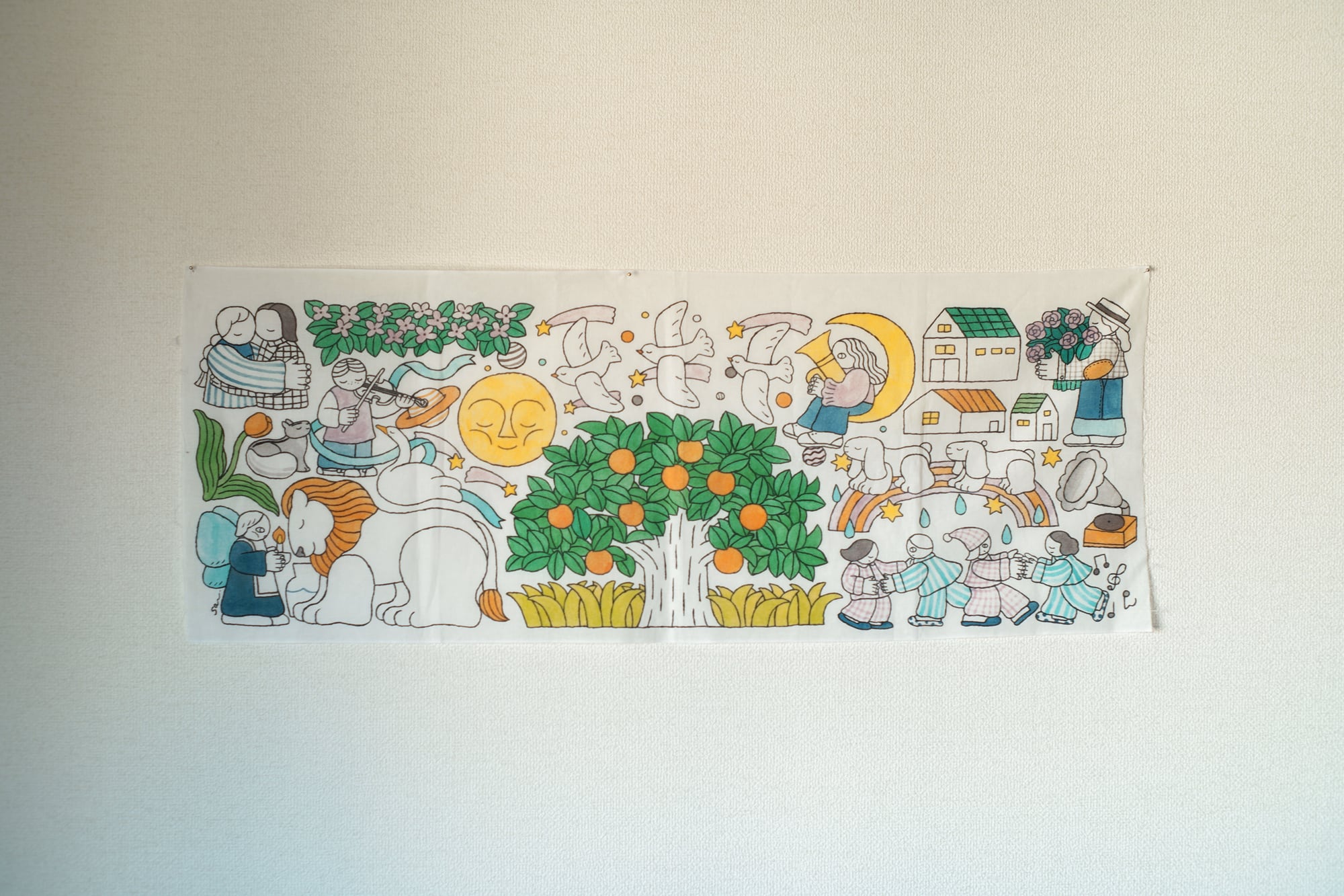 イラスト"あんしんして、おやすみ"をプリントした手ぬぐいです。